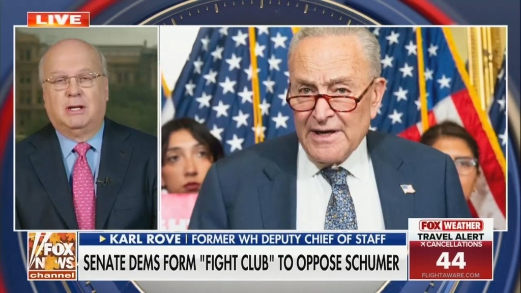 Karl Rove enjoys Democratic infighting, criticizing left-wing challengers against Schumer, and predicts it benefits Republicans in battleground states.