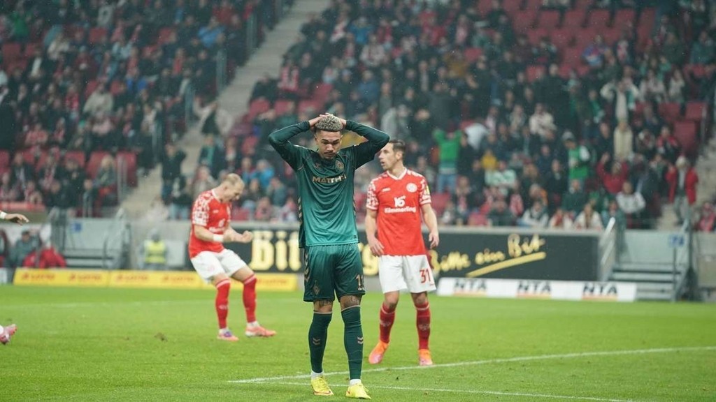 Werder Bremen liegt gegen Mainz 05 zurück; Steffen wechselt, Pieper rettet auf der Linie – Halbzeitstand 1:0 für Mainz.