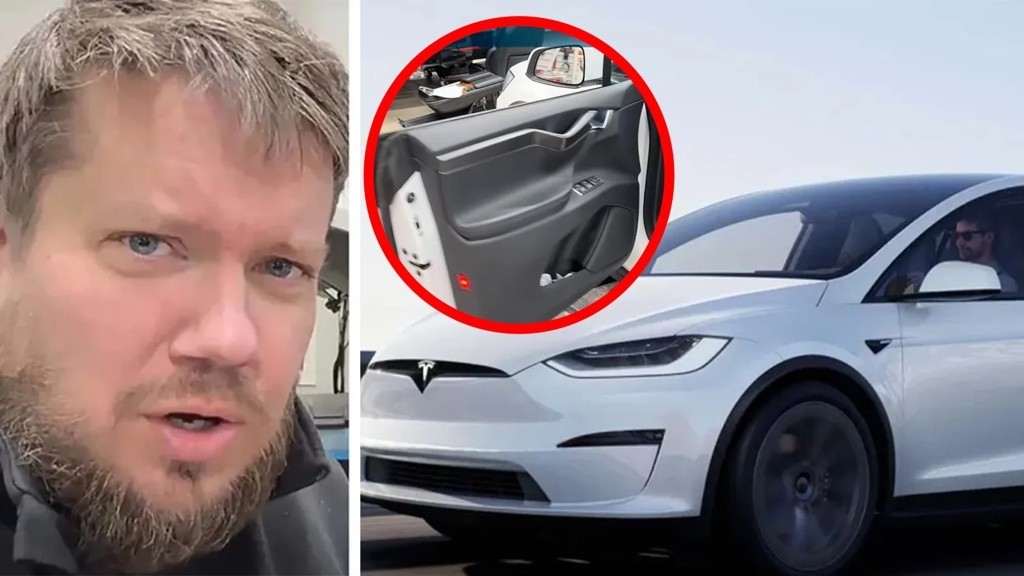 Tesla Model X:s automatiska dörr gick sönder, öppnade våldsamt på grund av vattenskador och trasiga delar. Reparationen innebar byte av delar och kalibrering.