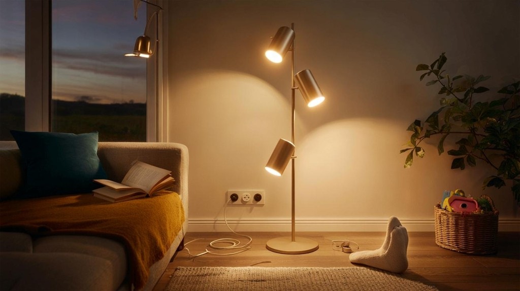 Lidl's £29.99 Livarno Home LED floor lamp features three adjustable spotlights, warm light, and a foot switch, offering flexible, cozy illumination for dark evenings.