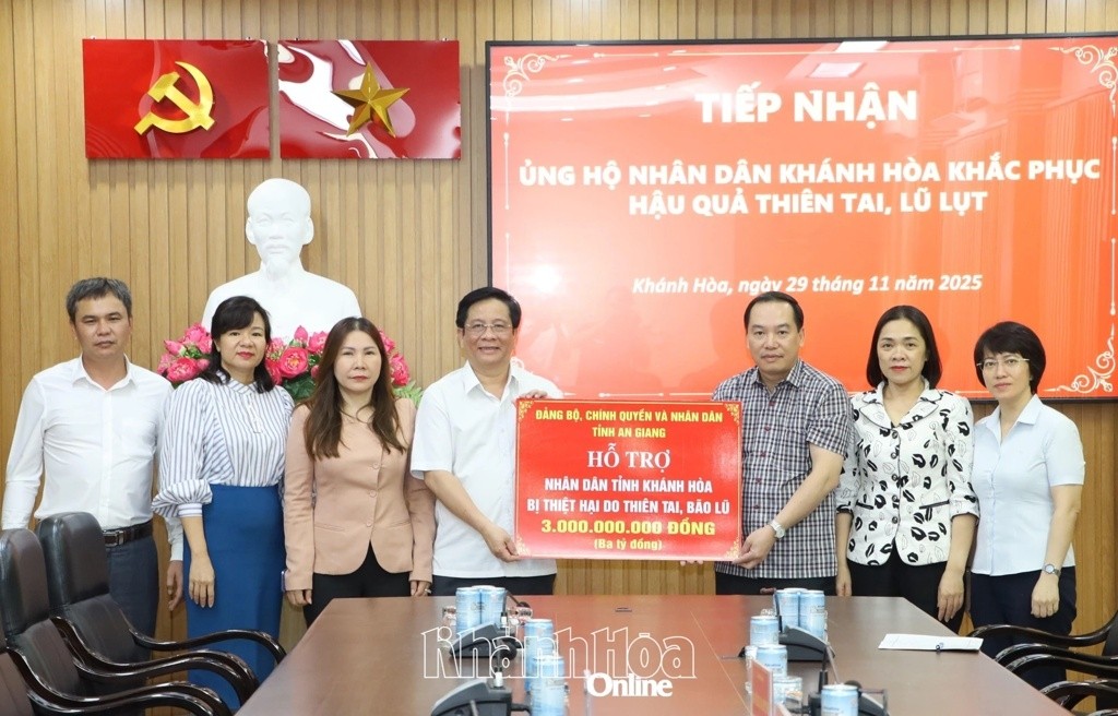 Tỉnh An Giang trao 3 tỷ đồng hỗ trợ Khánh Hòa khắc phục hậu quả mưa lũ, góp phần phục hồi và phát triển kinh tế - xã hội.